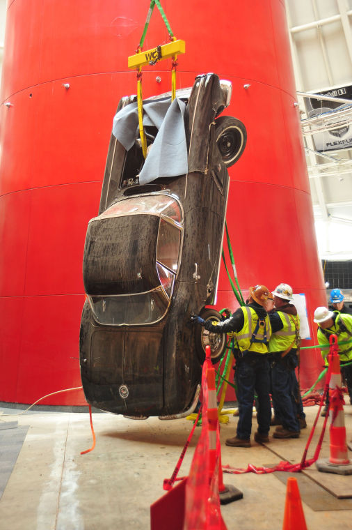 The 1962 Corvette didn’t fall nearly as far as the other 7 Corvettes in the massive sinkhole, but when it fell a large portion of the Skydome floor ended up pressed against the front end of the classic Vette. Also, the 1962 Corvette was part of a “lift display” under the 1993 Ruby Red Corvette and that lift also fell into the hole. The team was concerned that if they simply pulled the 1962 Corvette away from the 5 ton concrete slab, the sheet of manmade rock could shift and either cause more damage to the 1962 Corvette or it could fall into the hole and cause extensive damage to one of the other 5 cars still buried below. Because of those concerns, the team had to devise a plan to secure that concrete slab before moving the 62 Corvette. In addition to the headache of dealing with the concrete slab, the type of wheels and the angle at which the 62 Corvette was propped made it impossible for the extraction crew to lift this Corvette by the wheels like they did with the first two cars that came out of the hole yesterday.Once the team had drilled a hole through the concrete slab and secured it – as well as removing the crumpled lift – they were able to remove the hood and run lifting cables around the front portion of the chassis which holds the engine in place. Thick strips were wrapped around the engine mounts and the radiator support, then attaching crane cables to those straps so that the 1962 Corvette coule be lifted out nose first. Once up and out of the hole, the black 62 Corvette was carefully set on all four wheels. While it did not start and drive away like the 2009 Corvette, the team was able to push it easily out of the opening in the side of the Skydome.
