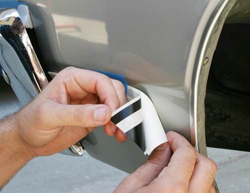 Carefully locate the final position of the stripe on the body panel with masking tape.