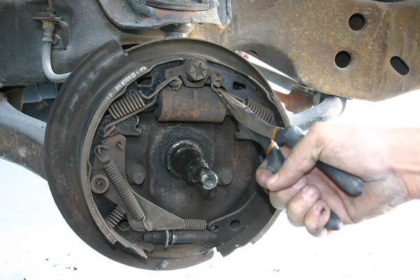 Before digging into the mess, spray the shoes, springs, and hardware down with brake cleaner. Do NOT use compressed air! Brakes shoes contain cancer-causing asbestos. One at a time, remove the springs, screws, pins, and levers from the inner brake assembly. Specialty tools are readily available at any parts counter to help make this chore a little easier. I definitely recommend using them. When approaching the shoes, notice the different in size of the primary and secondary linings. The primary (leading) shoe has a shorter lining than the secondary (trailing) shoe and is mounted to the front of the wheel.