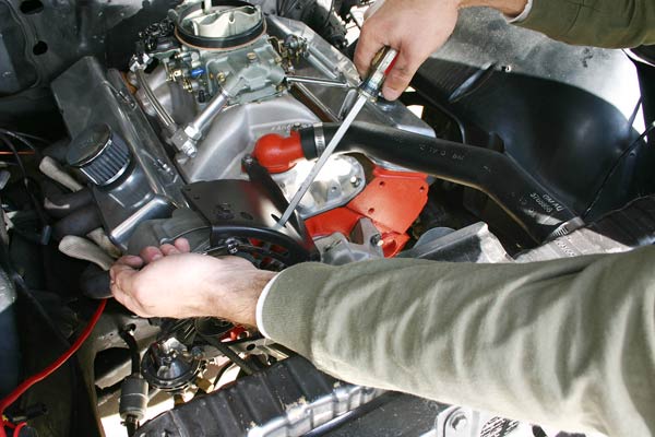 Installing the new fan belt in your Corvette is relatively straightforward and painless. Slip the new rubber (right side up) over the pulleys and grab your biggest, meanest screwdriver. A thin pry bar will work as well. Leverage the bar under the alternator and force it to slide up and out (opposite of the way it was loosened). When the alternator is back into position, tighten the slide bracket adjusting bolt to hold it in place. Check for proper tension by depressing the belt midway between the two pulleys. The belt should deflect about ½ inch if the distance between the pulleys is 12ā-16ā, or ¼ inch if the distance is between 6ā-10ā.